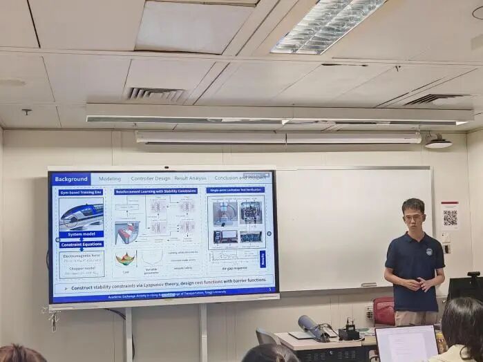 学院刘林坤、赵韫之、栾逸、黄志创四位同学先后围绕自动驾驶车辆人机交互信任困局、高密度城市环境自行车友好属性、交通流人工与信号协同控制、高速磁悬浮车辆悬浮系统控制等研究内容展开汇报。双方教师及学生均进行了踊跃的提问与互动,随后,师生一起参观了香港大学的教学楼并合影。