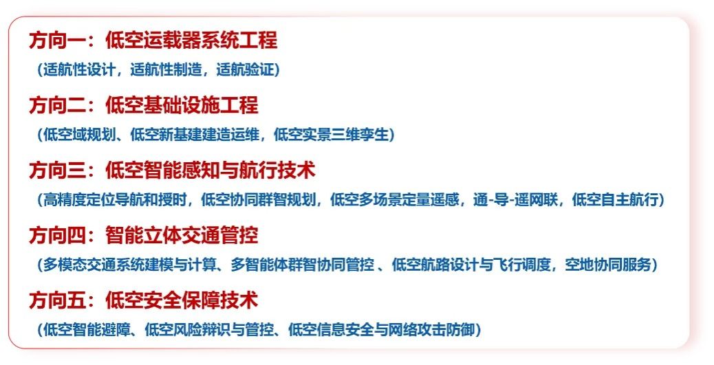 学科建设重点聚焦五大方向:“低空运载器系统工程”、“低空基础设施工程”、“低空智能感知与航行技术”、“智能立体交通管控”、“低空安全保障技术”。
