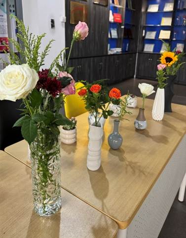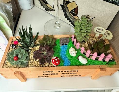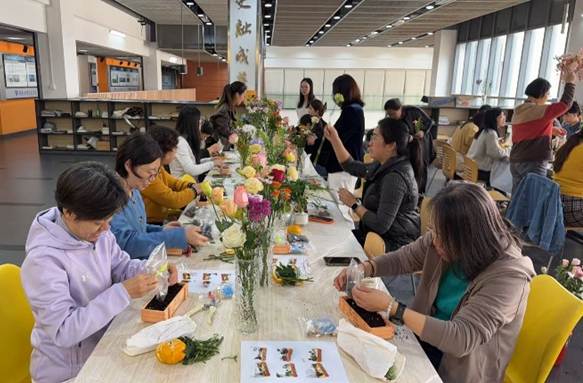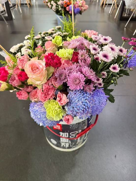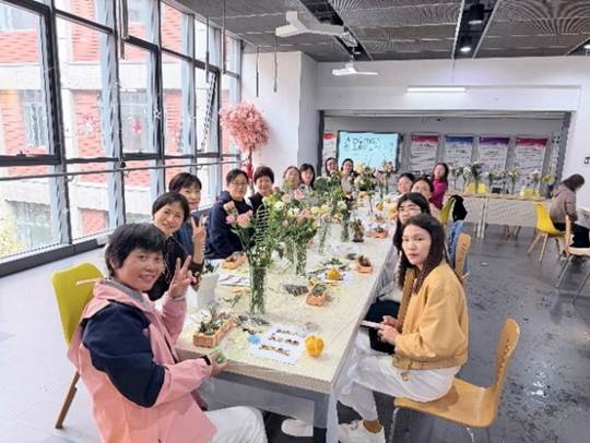 经过一个多小时的创作,四十余件独具匠心的花艺作品新鲜出炉:清雅的鲜花花束、古朴的干花摆件、灵动的多肉盆栽,每一件都承载着创作者的巧思。老师们纷纷捧着作品拍照留念,镜头里,沾染花粉的指尖与映着绿意的笑靥相映成趣。活动尾声,大家带着亲手制作的花艺作品返程,不少人已开始规划工位摆放方案。