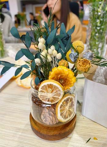 在实操环节,老师们根据喜好自主选择创作方向,现场瞬间变身创意实验室。鲜花区里,交通学院的孙老师正专注地修剪花枝,按照 “上散下聚” 的原则将粉玫瑰与白色洋桔梗错落搭配,“平时埋首科研论文,难得有机会静下心来做手工,指尖触到花瓣的瞬间就觉得很放松”;干花创作区中,医学院的李老师用松果与尤加利叶搭配出北欧风摆件,她说:“干花不用频繁打理,放在办公桌上能长久保持生机”;多肉区更是人气高涨,老师们小心翼翼地将玉露、熊童子等幼苗植入花盆,再铺上铺面石,迷你景观在掌心渐次成型。