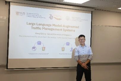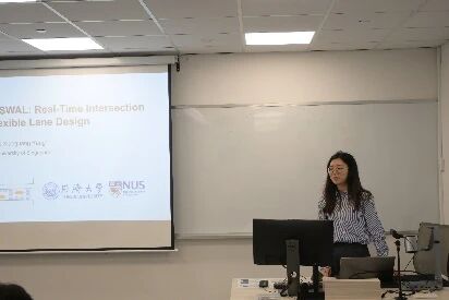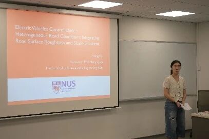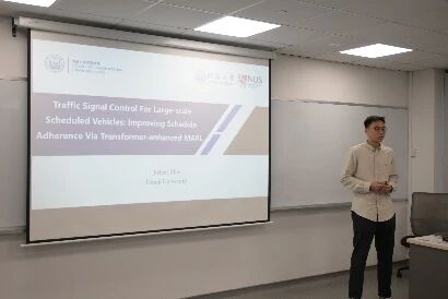 在后续的学术交流环节,同济大学师生围绕网联环境下的交通系统优化、智能驾驶、公共交通调度、交通行为分析等方向进行了多场精彩报告,内容涵盖车辆群体智能控制、强化学习控制、自主响应式公交调度、城市路网动态边界控制、信号控制与车辆路径协同优化、快速路与交叉口协同鲁棒控制、基于驾驶风格表示的交通控制优化等。新加坡国立大学的学者则从数字化交通规则、大语言模型应用、网联车辆自适应控制、异质路况电动车管理、车联网通信可靠性、多层级交通事故风险预测等角度,分享了其在智能交通系统领域的创新成果,展现了多学科交叉融合的研究特色。论坛期间,两校师生还围绕报告内容展开了热烈讨论,在理论方法、技术路径与应用场景等方面碰撞出诸多智慧火花。