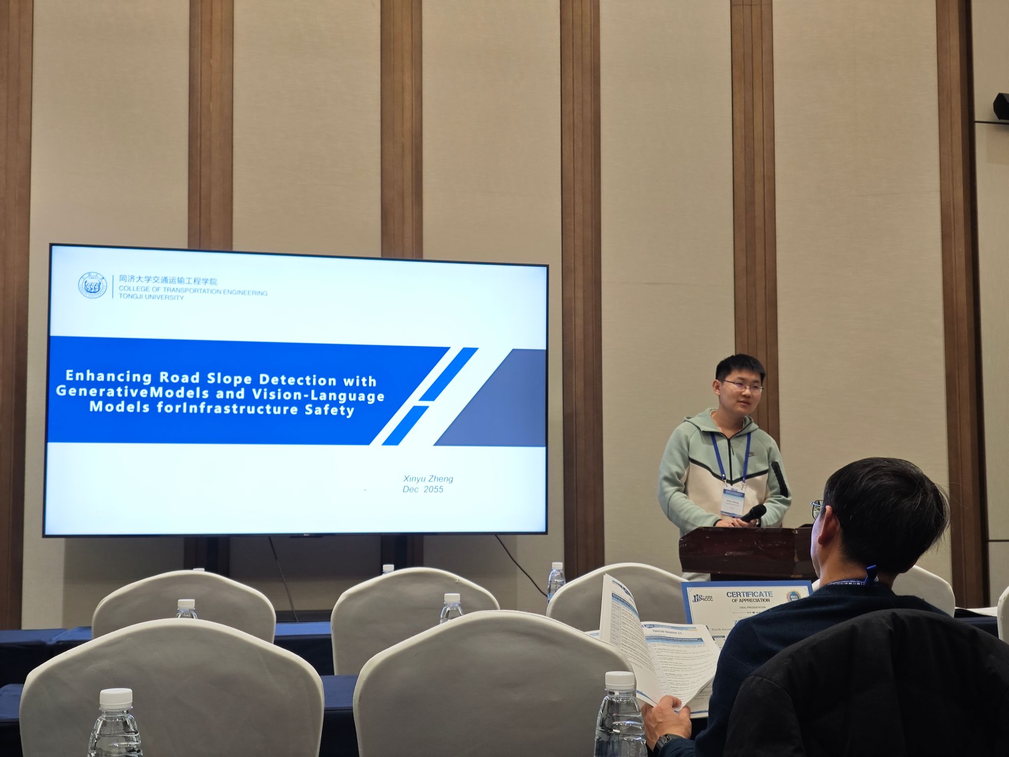 2025年12月14日,磁浮中心轨道技术及智能运维课题组博士生郑新禹在ICCC2025计算机与通信国际会议上作了题为“Enhancing Road Slope Detection with Generative Models and Vision-Language Models for Infrastructure Safety”的口头报告。