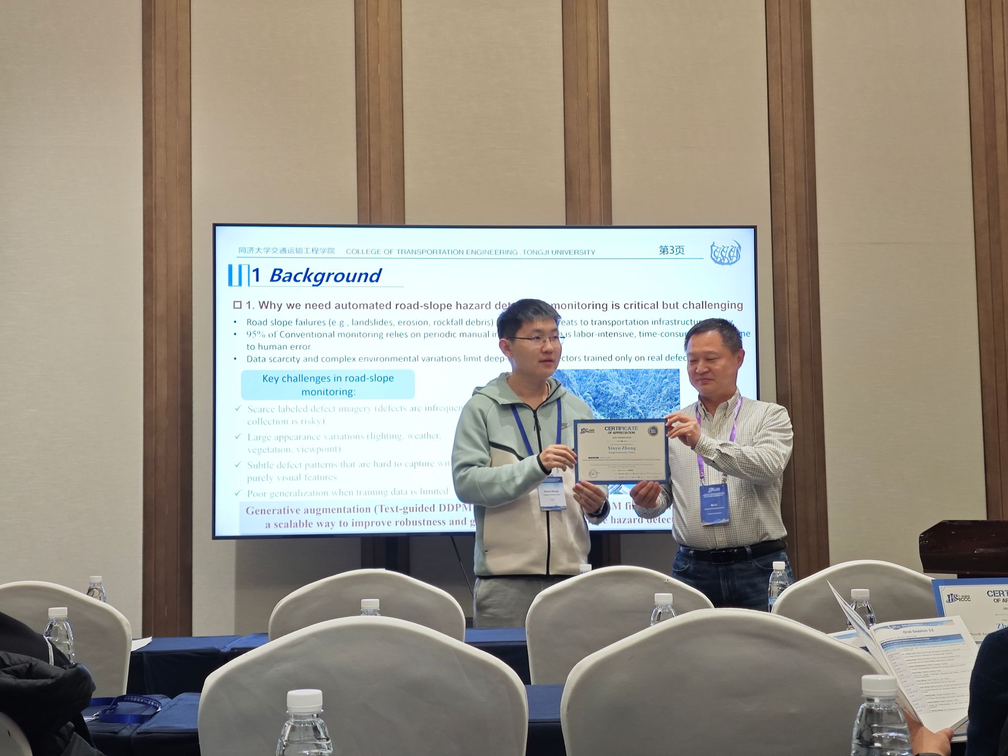 该报告聚焦于道路边坡灾害对交通基础设施安全的严重威胁,针对现有监测方法因缺陷图像稀缺和环境复杂多变而面临的检测精度低、泛化能力弱等核心挑战,系统提出了一种融合生成模型与视觉语言模型的新型两阶段检测框架。该报告从众多投稿中脱颖而出,荣获大会颁发的“最佳会议论文奖”与“最佳口头报告奖”双项荣誉。