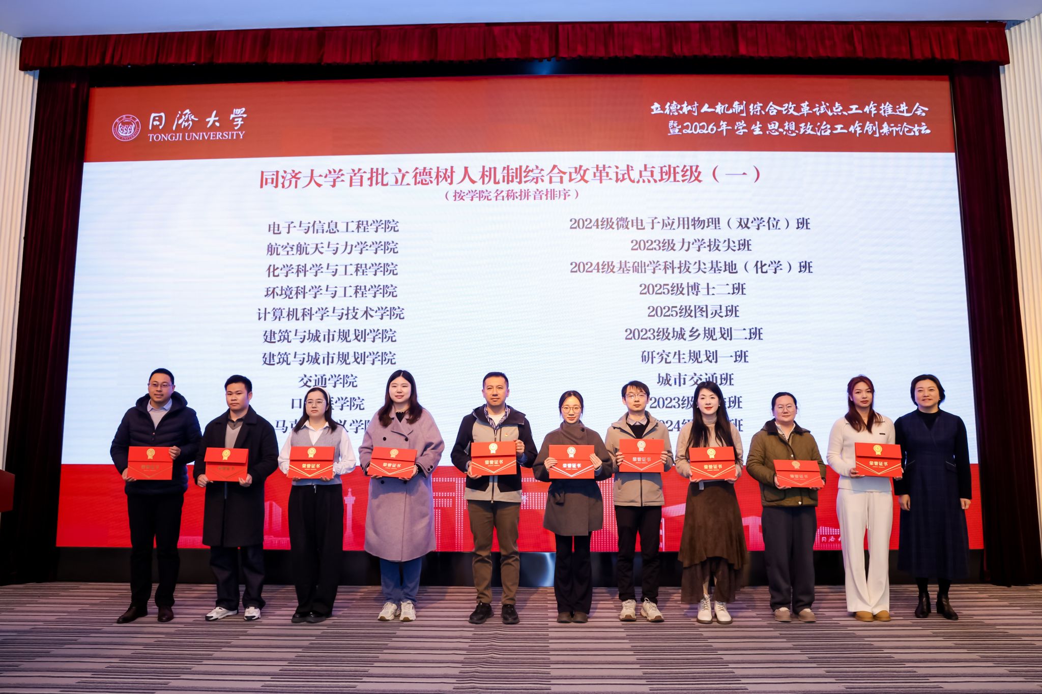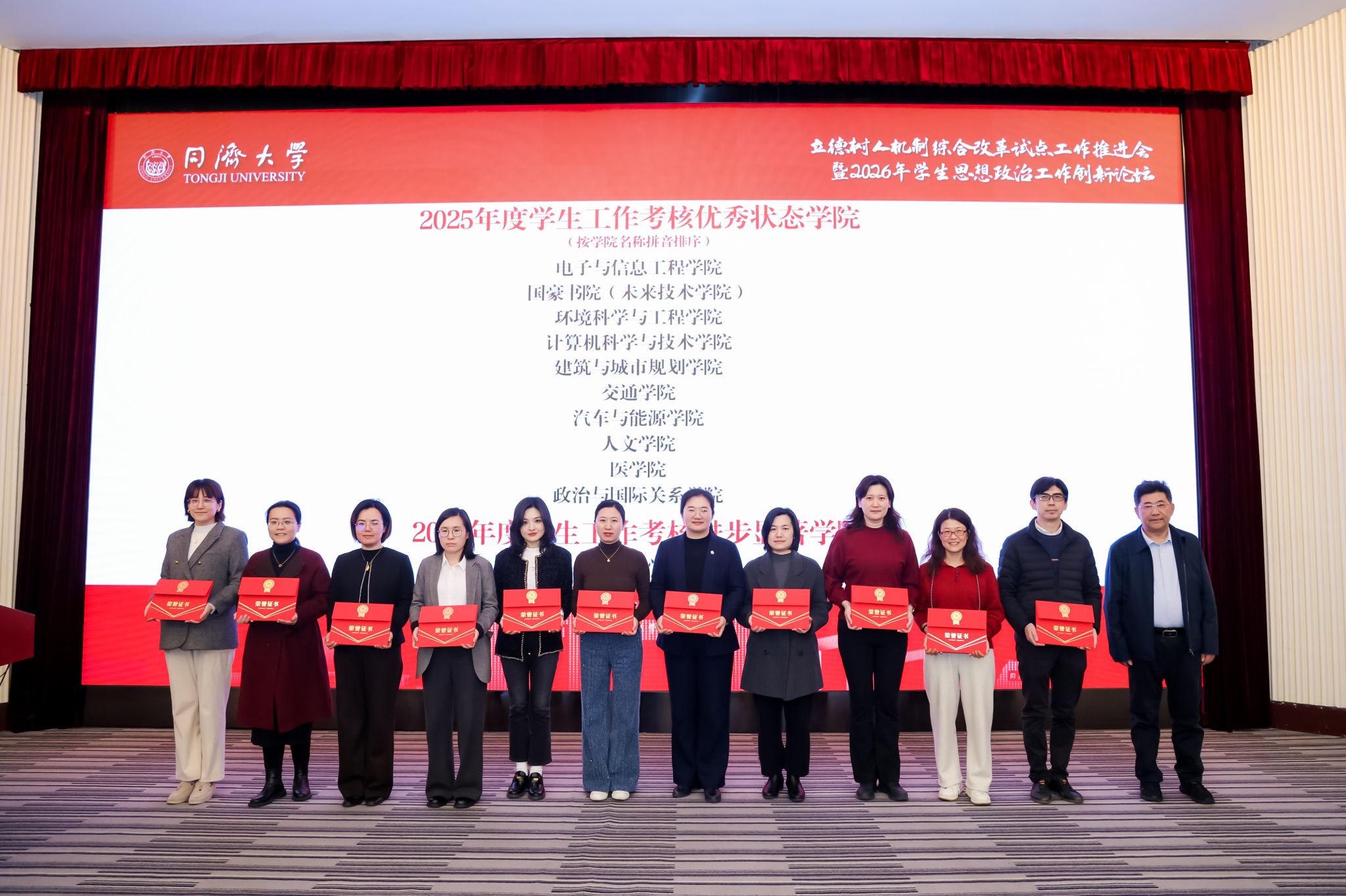 为深入学习贯彻党的二十大精神,全面落实立德树人根本任务,持续推动学生思想政治工作高质量发展,1月15日,同济大学立德树人机制综合改革试点工作推进会暨2026年学生思想政治工作创新论坛在四平路校区成功举行。大会表彰中,交通学院成功入选“同济大学首批立德树人机制综合改革试点学院”,并获评“同济大学2025年度学生工作考核优秀状态学院”;轨道车辆智能行驶研究团队成功入选“同济大学首批立德树人机制综合改革试点教学科研团队”,城市交通班成功入选“同济大学首批立德树人机制综合改革试点班级”,陆昱蓉老师荣获“2025年度优秀学生思想政治工作者”。